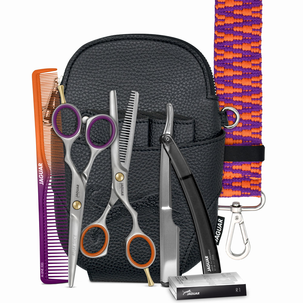 Ciseaux de coupe professionnels de la gamme JAGUAR PRE STYLE en acier spécial pour un très bon tranchant durable. Disponibles au choix en trois variantes de branches. Tous les kits comprennent : Ciseaux de coupe et ciseaux sculpteurs professionnels JAGUAR PRE STYLE Rasoir R1 M BLACK avec support métallique pour toutes lames standards 10 lames R1 inclus Peigne de coupe A-LINE BICOLOR 7.25"" CROSSBAG (trousse holster), format L 14,5 x H 21,5 x P 3 cm.