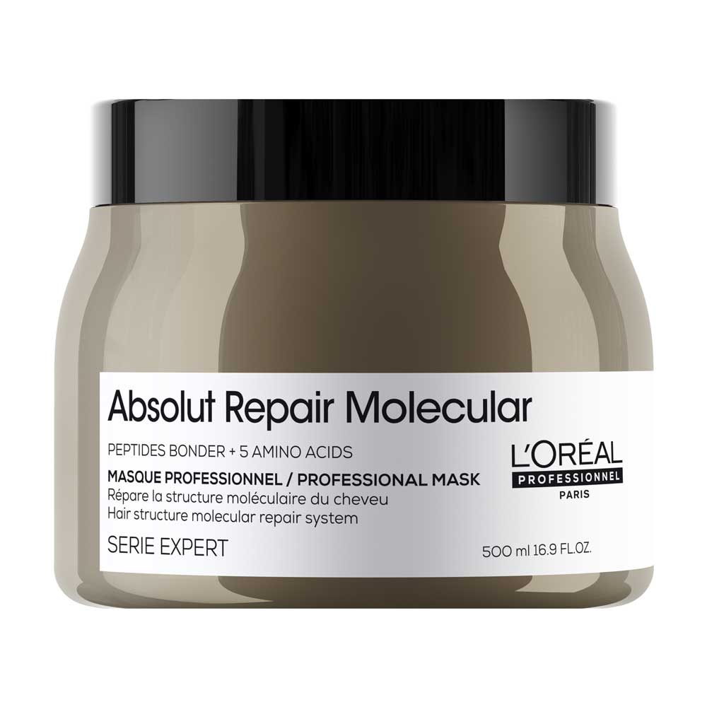 "Le masque Absolut Repair Molecular de L'Oréal Professionnel Paris a été spécialement conçu pour tous les types de cheveux abîmés. Il répare jusqu'à 2 ans de dommages en une seule application.* Enrichi en liants peptidiques et en 5 acides aminés, il pénètre dans la structure moléculaire du cheveu et le transforme instantanément. Sa texture soyeuse et crémeuse, inspirée des soins de la peau, pénètre immédiatement dans la fibre capillaire, la nourrit et la renforce sans l'alourdir. La force, l'élasticité et la mobilité des cheveux sont restaurées. Résultat : +94% de cheveux plus forts**, d'apparence saine et +85% de souplesse avec un peignage extra.