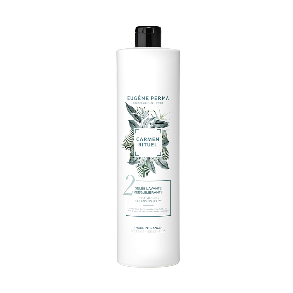 La Gelée Lavante Rééquilibrante CARMEN RITUEL d'EUGENE PERMA Professionnel aux huiles de Sacha Inchi Bio et de Jojoba Bio élimine les résidus alcalins et nettoie en douceur les cheveux après la couleur. Elle referme les écailles des cheveux et aide à rééquilibrer le pH de la fibre capillaire.