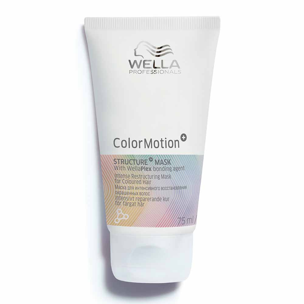 Wella Professionals ColorMotion+ Structure Mask is een diep verzorgend haarmasker die helpt de levendigheid van gekleurd haar tot 8 weken* te behouden en te beschermen en tegelijkertijd zorgt voor een beschermde haarstructuur en veerkrachtig haar. Het masker is geformuleerd met WellaPlex+ Bonding Agent en Hair Surface Polisher technologie, om de haarbindingen in gekleurd haar te herstellen en het haar te beschermen tegen schadelijke metalen.
